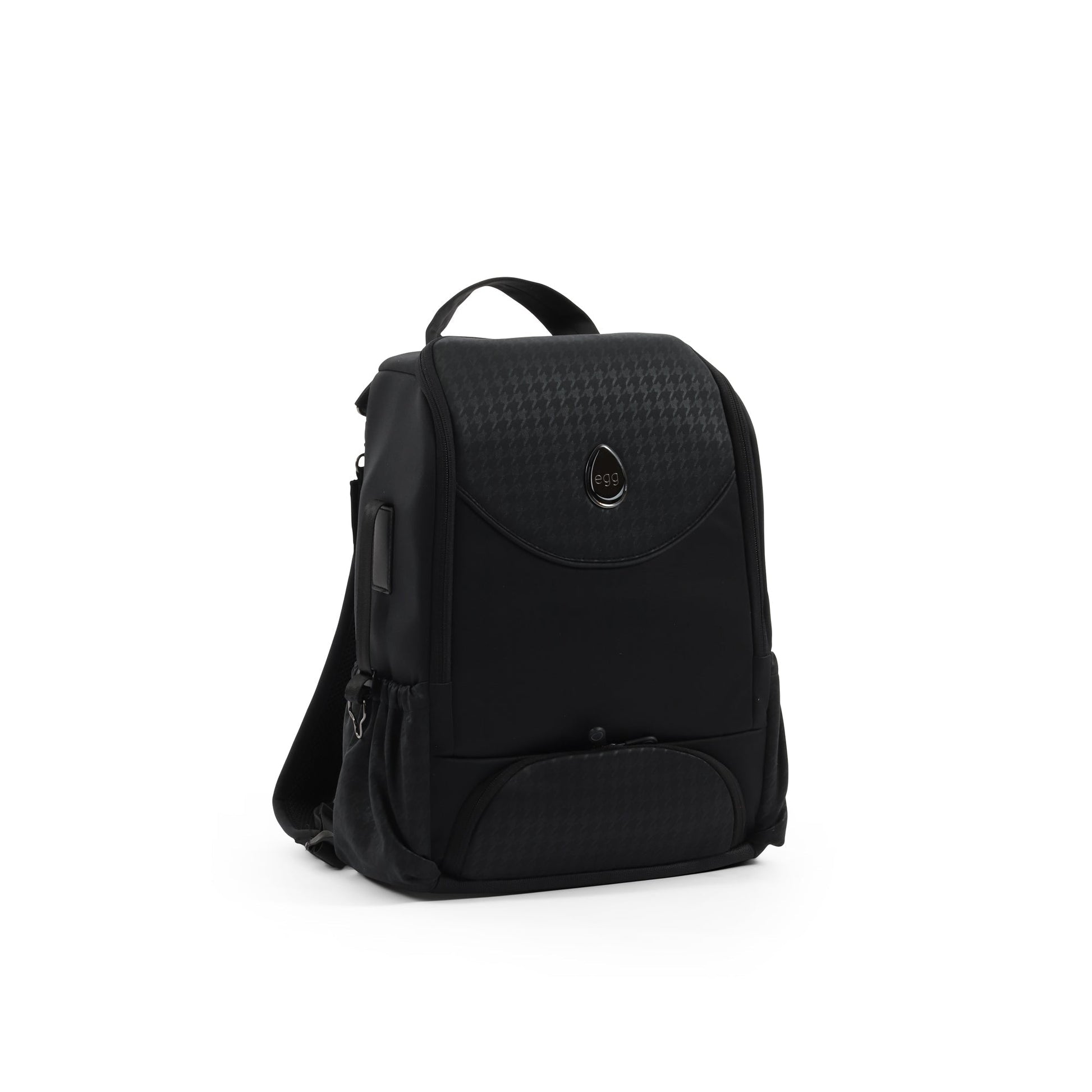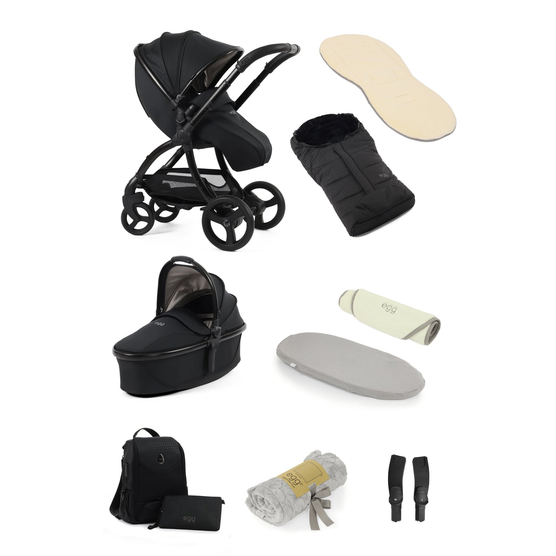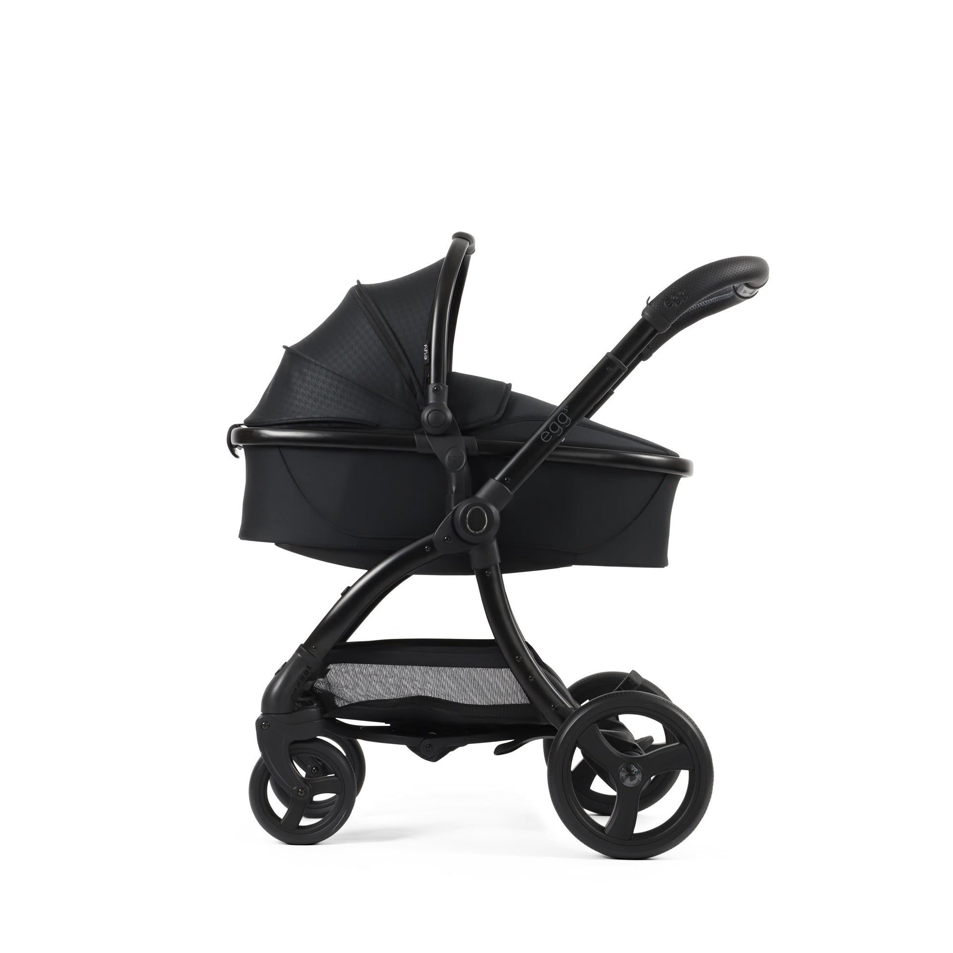 The egg3 9 Piece Snuggle Bundle in Houndstooth Black, a timeless blend of sophistication and style. Enveloped in the classic charm of the houndstooth pattern and sophisticated black tones, the Houndstooth Black gracefully adorns an all-black chassis with a luxury hand-stitched handle and bumper bar in black perforation, elevating the whole aesthetic.